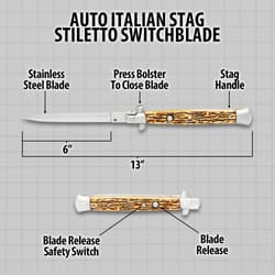 Auto Italian Stag Stiletto Switchblade Knife - 13" Open, 7" Closed, Safety Lock, Faux Stag Handle, Includes Nylon Pouch