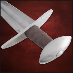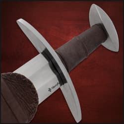The hilt assembly is authentically styled with a straight, mildly curved steel crossguard and a distinctive lens-shaped pommel — both polished to a bright satin finish that contrasts beautifully against the dark, textured leather-wrapped handle. The tightly wound grip provides a secure, comfortable hold that encourages extended use, whether for display, stage combat, or historical study.