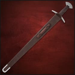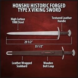 A premium leather-wrapped scabbard accompanies the sword, complete with a wooden belt loop for period-correct carry. Metal chape and throat fittings protect the scabbard's ends, rounding out a presentation worthy of any serious collector. The Honshu Historic Forge line is built for those who demand historically grounded design without sacrificing real-world durability, making this Type X Viking Sword a standout centerpiece in any collection.