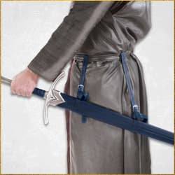 Measuring 39 inches overall, the Glamdring scabbard features a genuine leather wrap and straps, complemented by solid metal collar, fittings, buckles, and tip finished in antiqued metal for an authentic look. Each scabbard includes a parchment certificate of authenticity, making it a perfect addition for collectors and fans who wish to showcase a piece of cinematic history.