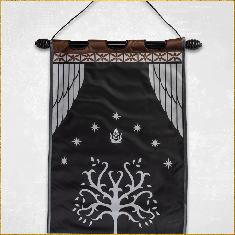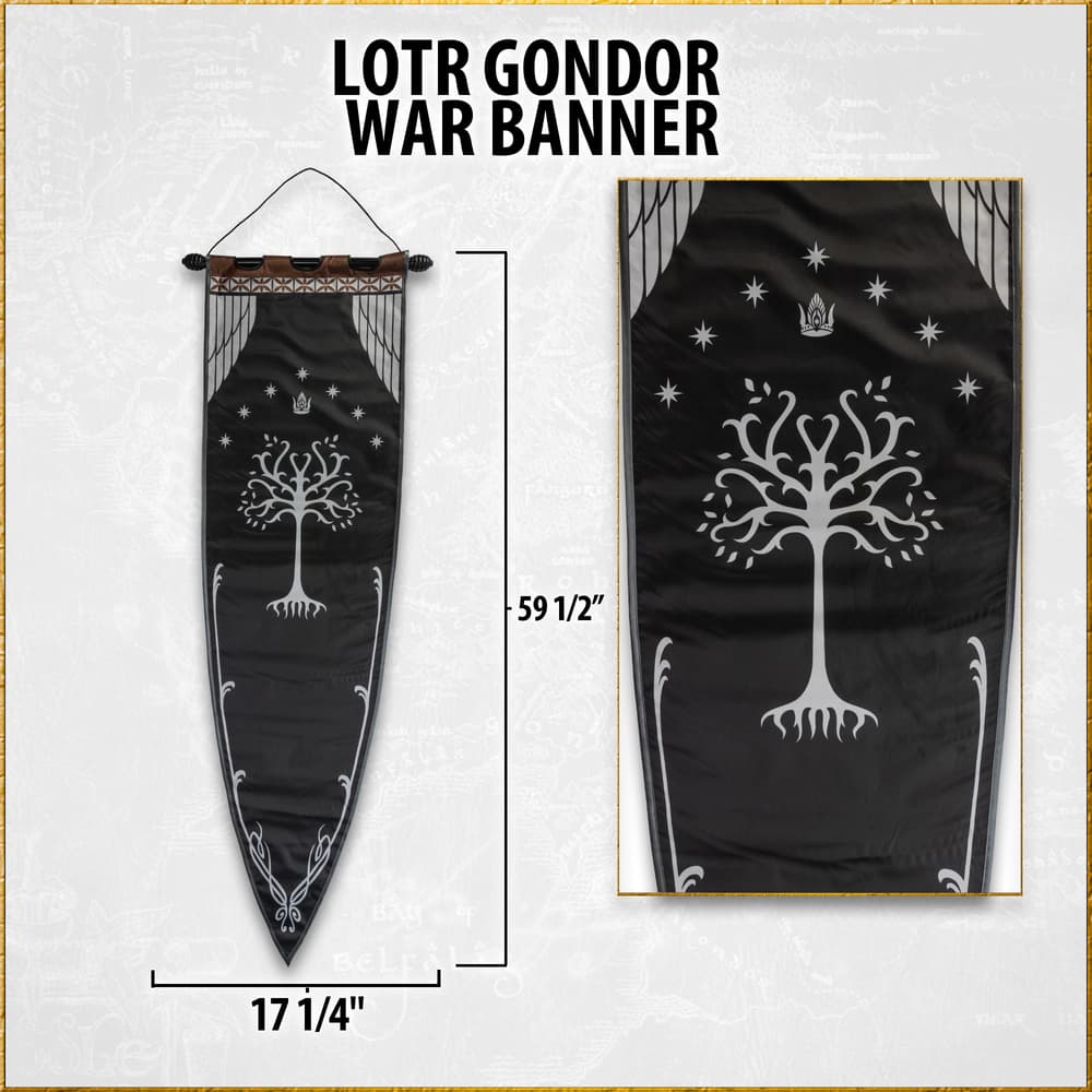 Inspired by the banner carried for Aragorn in The Lord of the Rings: The Return of the King, this officially licensed Gondor War Banner is a faithful reproduction made for display. Crafted from high-quality nylon cloth, it features the iconic White Tree of Gondor, the Seven Stars symbolizing the Palantíri and ships of Elendil, and the King’s Crown.