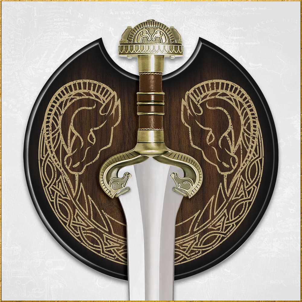 An exact replica capturing Eowyn's spirit, crafted with a 30 1/8-inch tempered 420 J2 stainless steel blade, leather-wrapped grip, antiqued brass fittings, and a premium wood wall plaque.