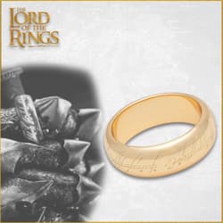 Forged by the Dark Lord Sauron to dominate all others, the inscription on the ring reads, “One Ring to rule them all, One Ring to find them, One Ring to bring them all and in the darkness bind them.” Every detail has been faithfully reproduced, from the smooth golden surface to the engraved script, making this replica a centerpiece for any Lord of the Rings collection.