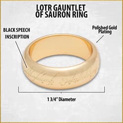 The Lord of the Rings Gauntlet of Sauron Ring by United Cutlery is an officially licensed, large-scale replica of the Ring of Power as worn by Sauron in The Fellowship of the Ring. Crafted of cast metal with a highly polished gold-plated finish, it matches the proportions of the original movie prop and features the infamous Elvish script in the Black Speech. This impressive collector’s piece measures 1 3/4” in diameter, giving fans a true-to-film recreation of Middle-earth’s most feared artifact.
