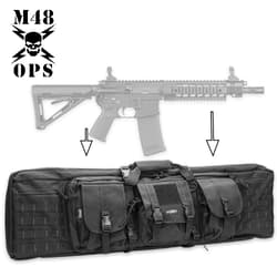 The M48 OPS Double Gun Case is designed to optimally secure and protect long guns and comes equipped with multiple storage areas to efficiently organize ammunition and accessories. At 42" long x 14" high it provides protection for two rifles during travel and storage and features two padded pistol pouches, as well. The thick, padded divider helps protect gun optics and padded backpack straps give you hands-free transport. There are four zippered storage areas and three large pouches for ammunition and accessories. The case also features MOLLE front panels to allow attachment of load-bearing equipment. Available in tan and black, we've got the bag just for you at a quality and price that just can't be beat!
