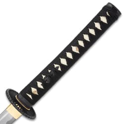 - The katana’s handle is premium wood, wrapped in traditional black cotton cord over white rayskin
