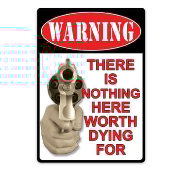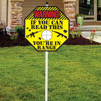 Who needs a burglar alarm when you own a âhigh-speed wireless device?â This clever sign doesnât mince words, boldly warning any would-be home invader that youâre packing heat and not afraid to use it! For everyone else, the signâs a good laugh. It has a tough plastic construction with vivid, weather-resistant artwork that states, âProperty Protected By High Speed Wireless Device. Second Amendment Security Co.â The yellow, octagon-shaped sign is securely bolted onto a 29â metal stake, which has a rubber tip at the top of it. Put it in the yard in front of your home, business and vacation home because it really gets the âno trespassâ idea across in a vivid way. Several of our employees have this sign displayed at their homes.